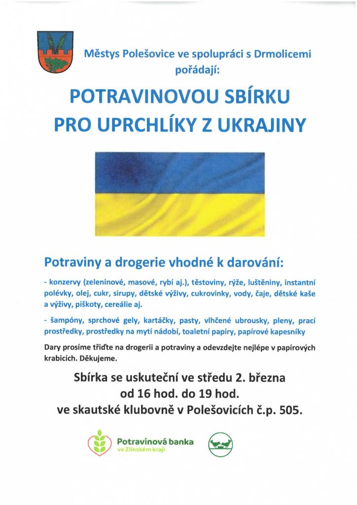 Děkujeme všem dárcům a přispěvovatelům do sbírky pro uprchlíky z Ukrajiny. Městys jako první ve Zlínském kraji odevzdal dary v Potravinové bance ve Zlínském kraji, z.s. Městys Polešovice a občané městyse darovali ukrajinským uprchlíkům 1 560 kg potravin a 616 kg drogerie. Děkujeme všem dárcům a také organizátorům!